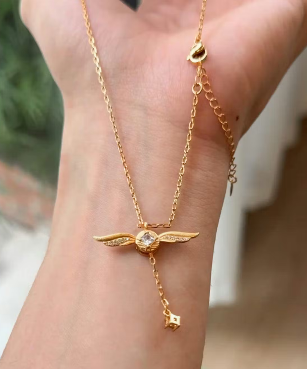 This piece is inspired by golden wings—not just in shape, but in the quiet strength they represent. Its gently shimmering form captures the elegance of flight, suspended in a moment between grace and motion. The slender drop design follows clean lines, while the soft sparkle mirrors light—preserving that radiant feeling in a form meant to move with you, always.