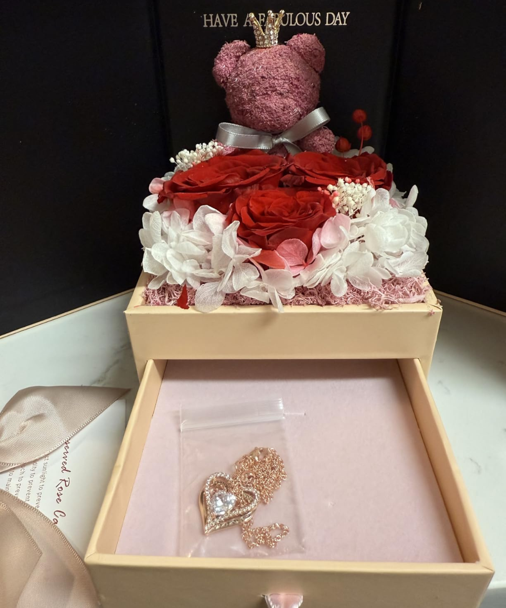 A real red rose carefully preserved to last for years without water or sunlight, presented in an elegant gift box alongside a dainty heart‑shaped necklace pendant for a meaningful touch. This beautiful set combines the timeless beauty of the everlasting rose with a delicate pendant, making it a thoughtful way to express love on anniversaries, birthdays, Valentine’s Day or any special moment.