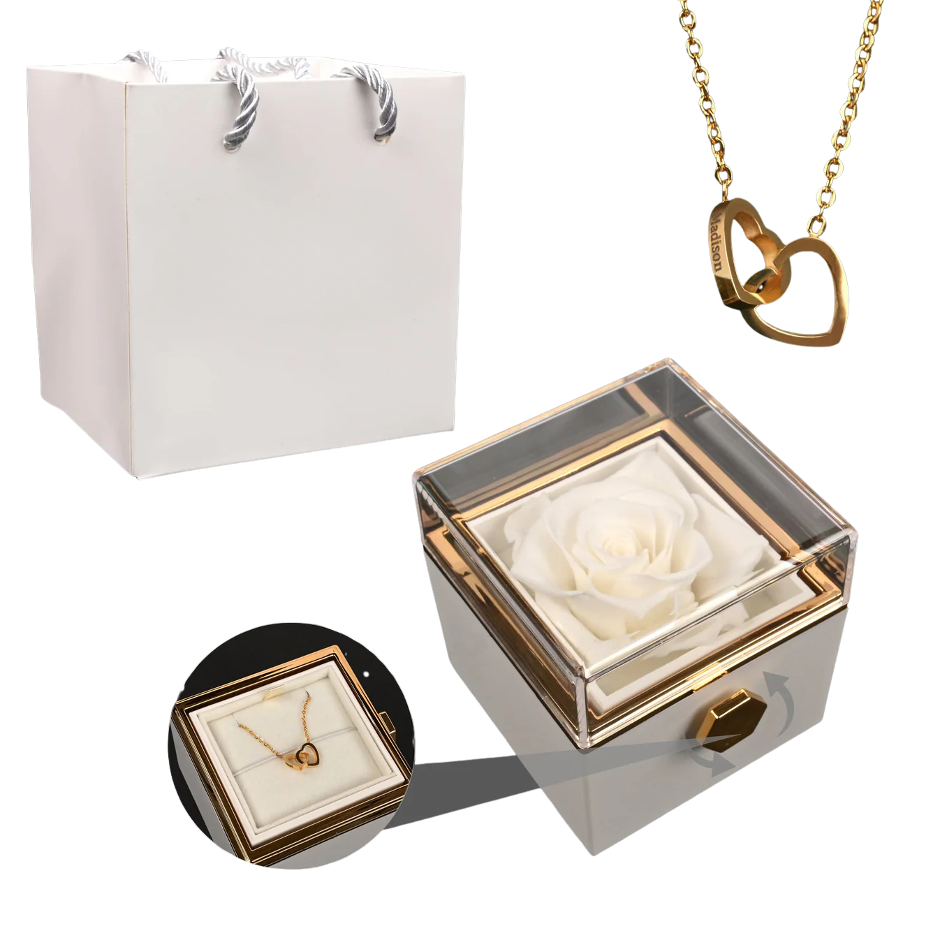 A preserved rose rests inside a refined keepsake box, revealing a softly shining engraved necklace designed to hold a message close. From the smooth presentation to the lasting bloom, every detail is created to capture emotion in a form meant to be opened, worn, and remembered.